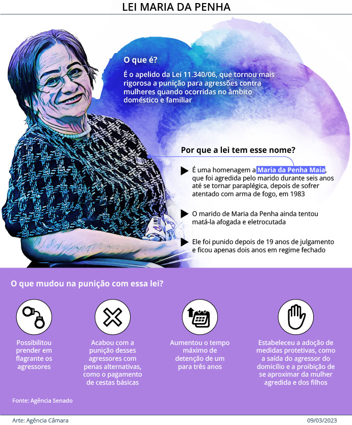 Maria da Penha Maia Fernandes tornou-se símbolo da luta contra a violência doméstica. Em 1983, sofreu duas tentativas de homicídio cometidas pelo então marido. Na primeira, levou um tiro nas costas e ficou paraplégica.