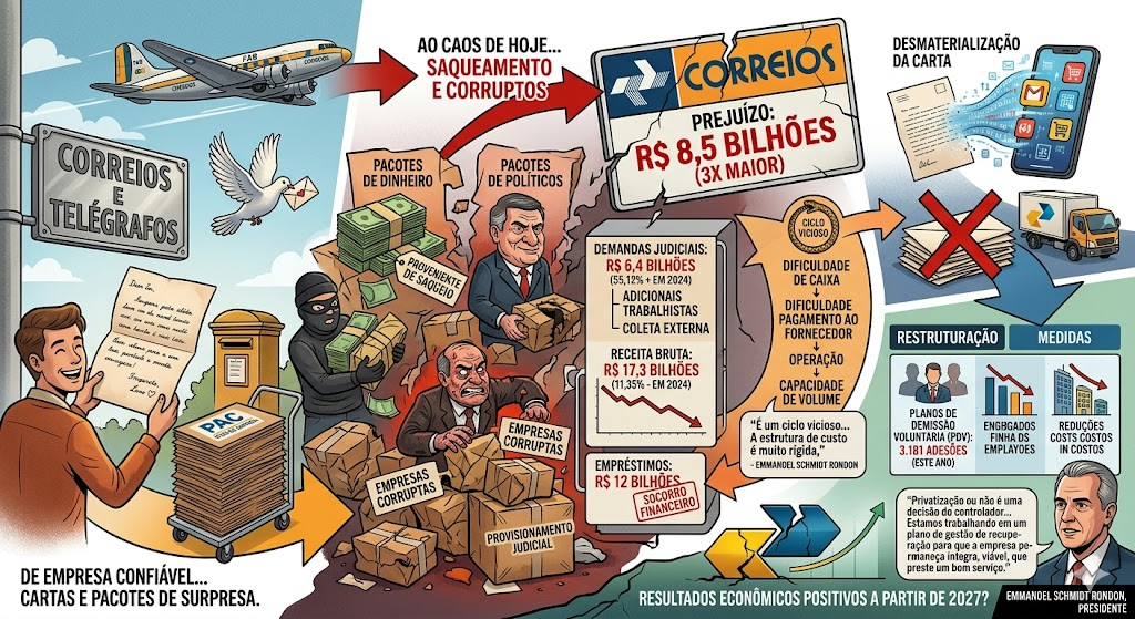 A estatal mergulhou em um ciclo vicioso onde a má gestão e o peso de processos judiciais (R$ 6,4 bilhões só em 2025) sufocam qualquer tentativa de eficiência. Enquanto o comércio eletrônico voa com logística própria, os Correios sofrem com a “desmaterialização” da carta e uma estrutura rígida que não aceita cortes. Entre empréstimos de R$ 12 bilhões e planos de demissão, a pergunta que fica é: até quando o contribuinte pagará a conta de uma empresa que se recusa a encarar a privatização enquanto afunda em 14 trimestres de prejuízo? Da pomba da paz ao caos operacional, o destino da estatal parece estar extraviado.